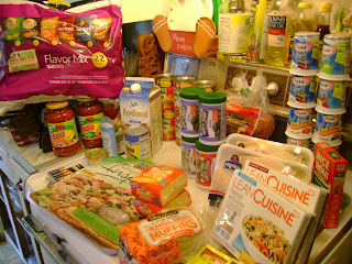 These are all things we bought with coupons and will use. We have added a freezer which is almost full of meat that I bought at a "reduced for quick sale" price, brought home, repackaged and stored in freezer. Also, frozen veggies, pizzas, ham, turkey, bread, and on and on. I won't even tell you how much toilet paper and shampoo we have. Let's just say we'll be clean on top and bottom for many months.